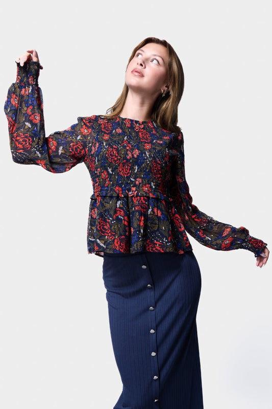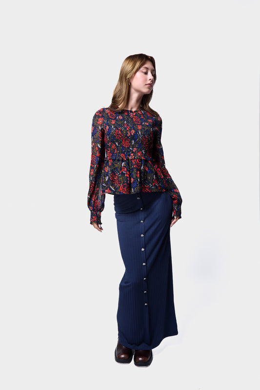 SHIRRING FOLK RUFFLE MIDI DRESS