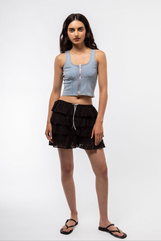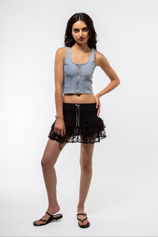 DENIM PRINTED PLEAT LOW RISE SKIRT