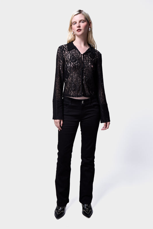 LOW RISE BIKER WASHED BOOT CUT JEANS IN BLACK
