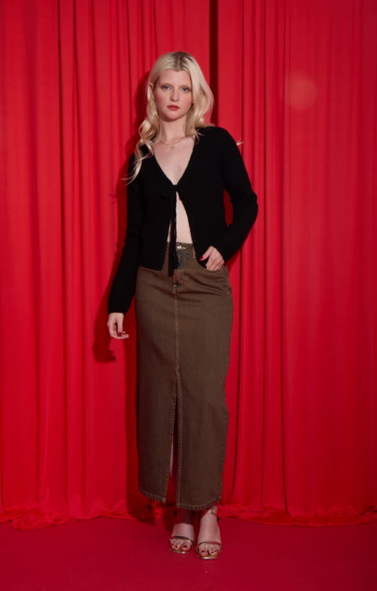 FRONT SLIT DENIM MAXI SKIRT IN VINTAGE BROWN WASH