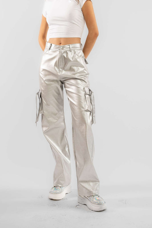 SILVER METALLIC COATED FAUX LEATHER CARGO TROUSERS