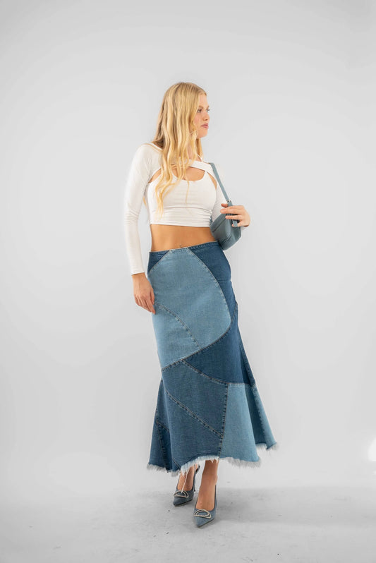 MIDI PATCH DENIM SKIRT IN MID BLUE