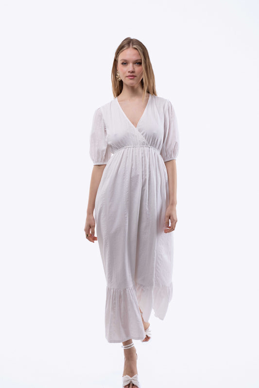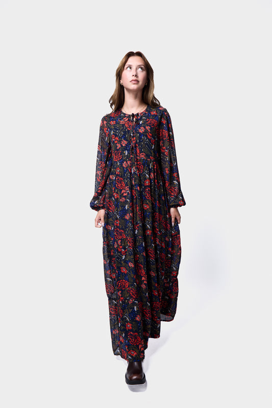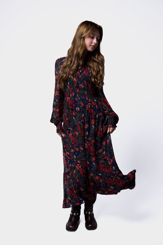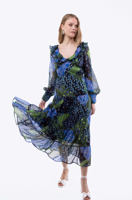 SHIRRING FOLK RUFFLE MIDI DRESS