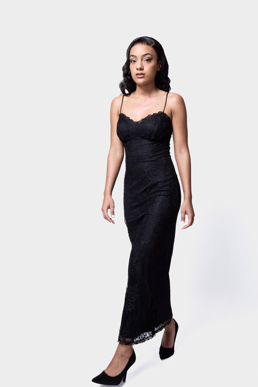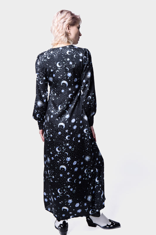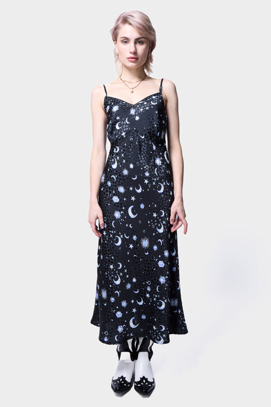 MOON PRINT LACE DETAIL SATIN MIDI DRESS