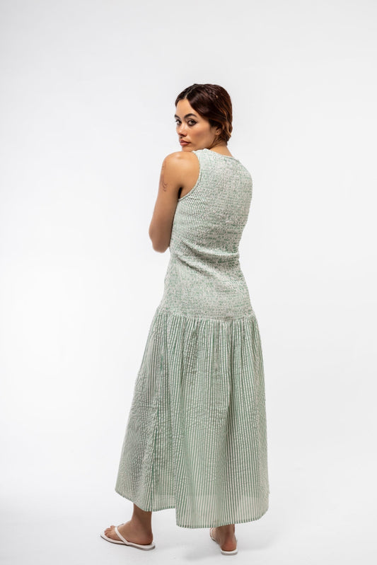 SHIRRED DROP WAIST MIDI DRESS IN MINT GREEN