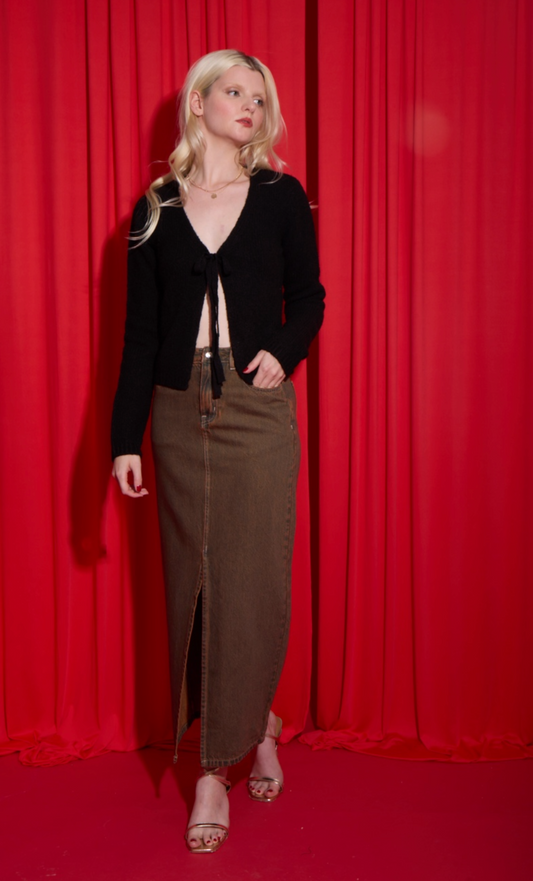 FRONT SLIT DENIM MAXI SKIRT IN VINTAGE BROWN WASH