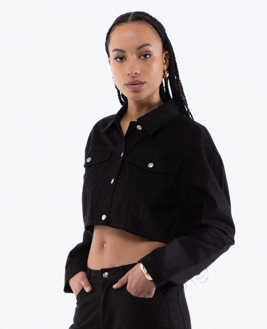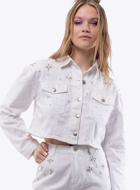 CROPPED RHINESTONE TRUCKER DENIM JACKET