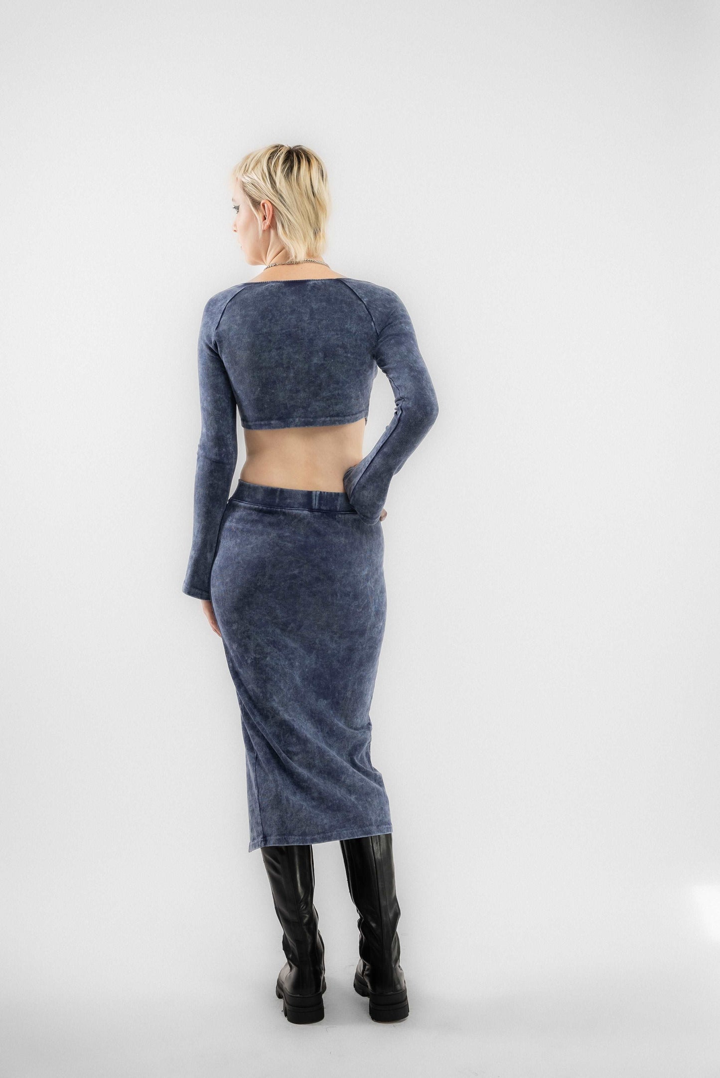 Crafted with a fitted, bodycon silhouette, this midi skirt features an elastic waistband for a secure and comfortable fit. The side slit detail adds a touch of edginess and movement, making it ideal for pairing with your favourite boots or sneakers. For a coordinated look, the matching midi top is also available to complete the ensemble.