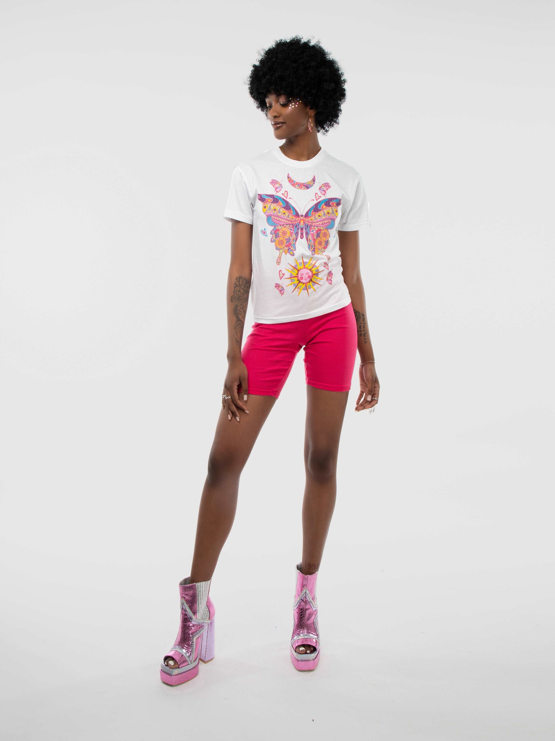 Stand out from the Crowd, Festival Girl's Blue Oversized Tee, with a Colourful Butterfly Print Design. Style with Shorts to be festival ready.
