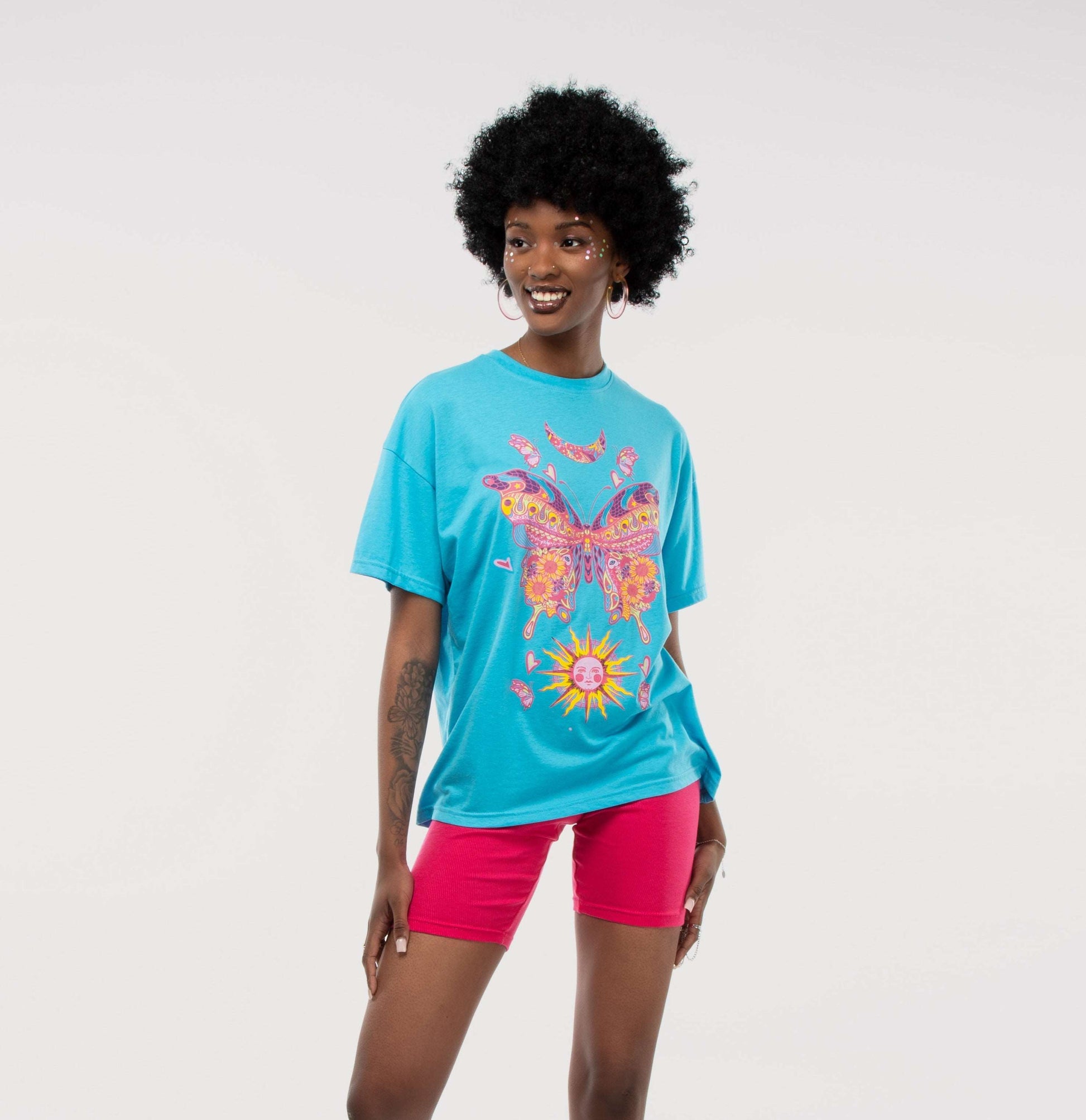 Add a pop of colour to your wardrobe with our Aqua Blue Colourful Butterfly Print Oversized Tee. This vibrant, oversized t-shirt features a stunning butterfly graphic in bright, bold colours, creating an eye-catching statement piece that's perfect for any casual outing. The butterfly symbolizes transformation and beauty, making it the ideal design for adding a touch of whimsy and charm to your everyday style.