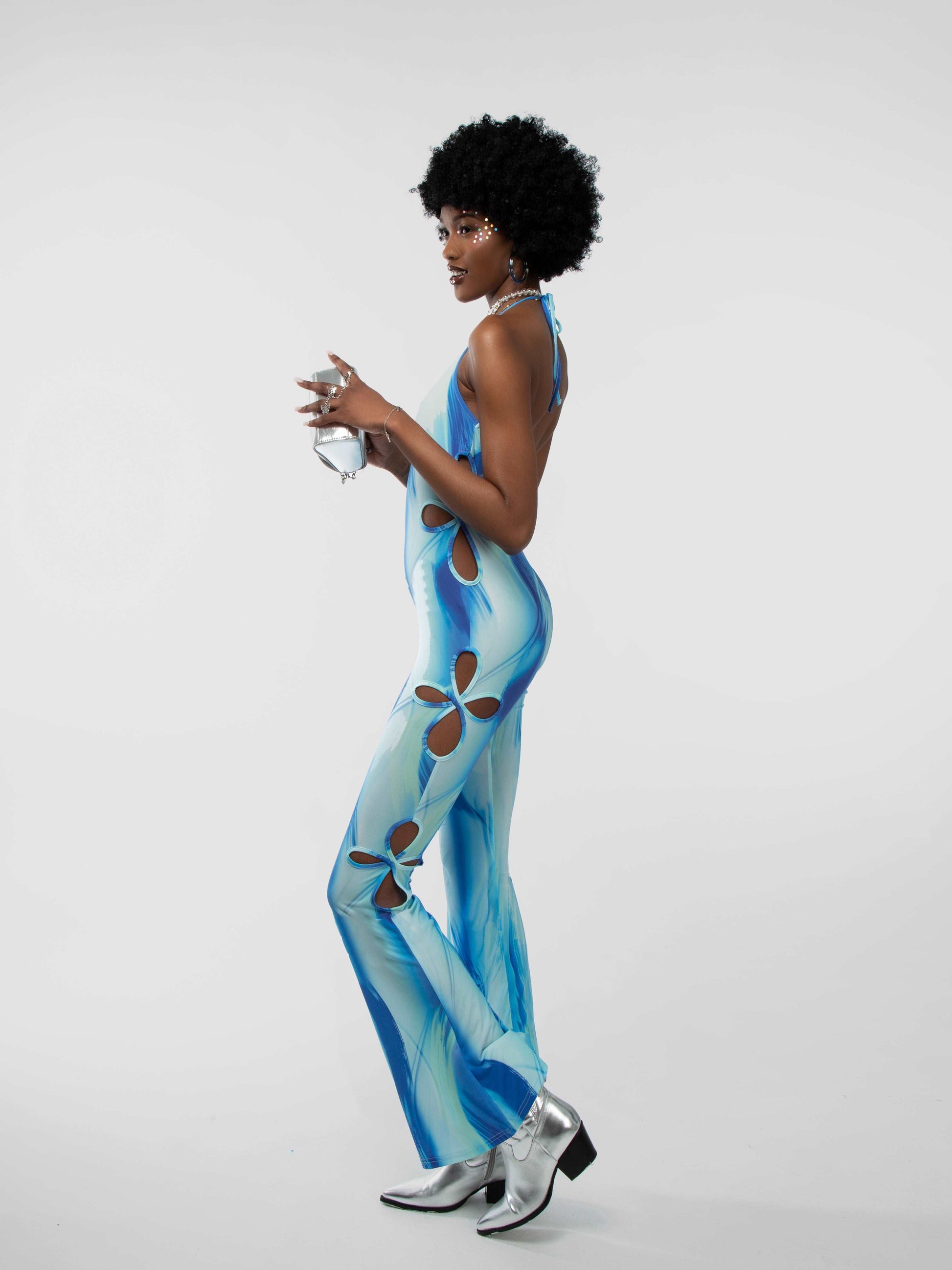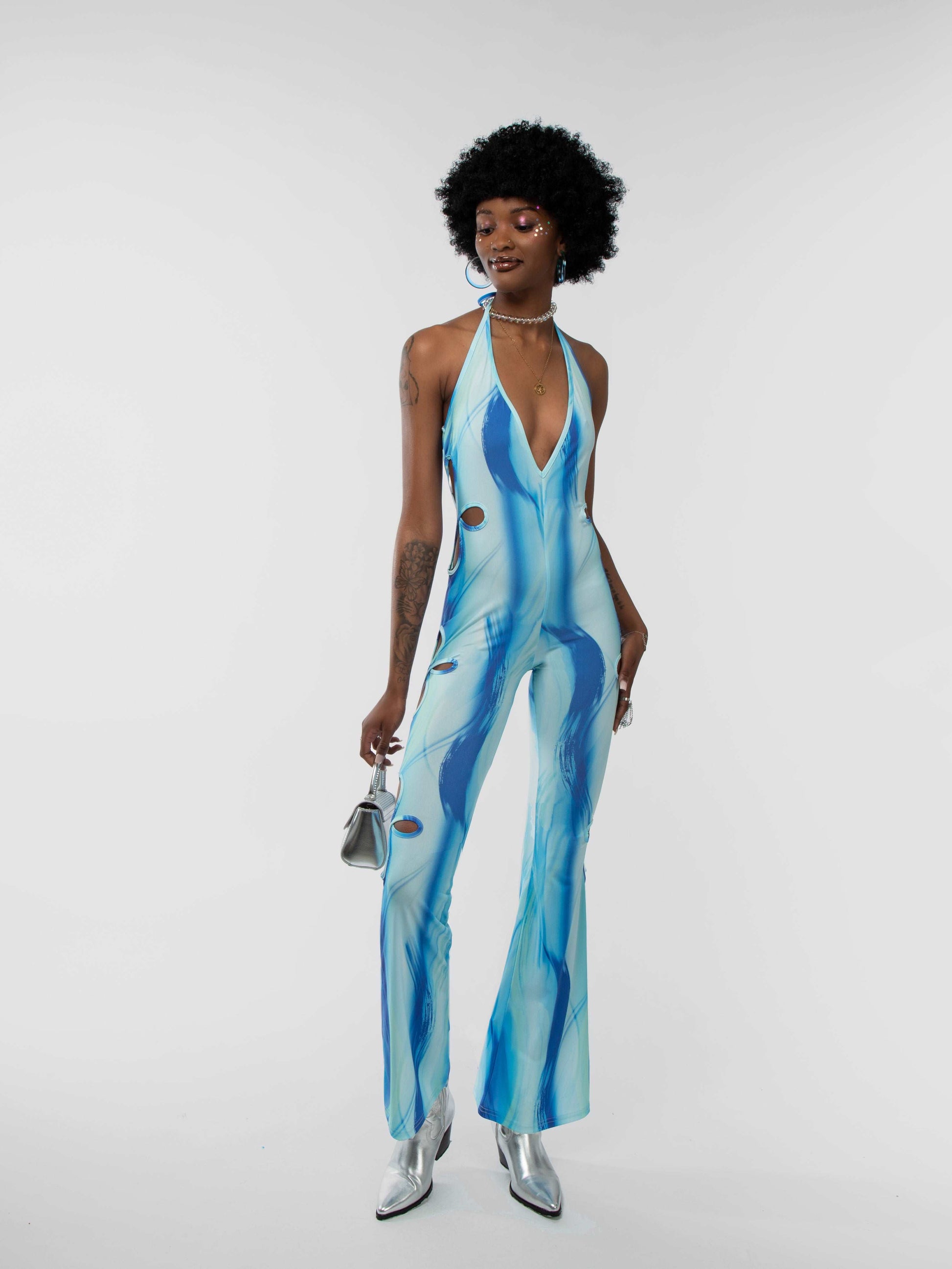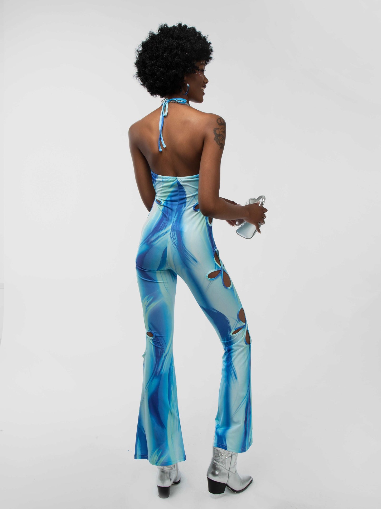 Show Off Your Delicious Curves. Festival Girl's Ombre Effect Print Flower Cut-Out Halter Neck Flared Jumpsuit. Style with Your Fav Boots to Make them Stop and Stare.
