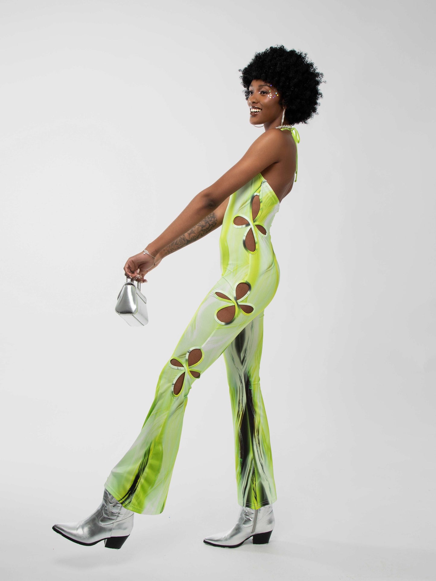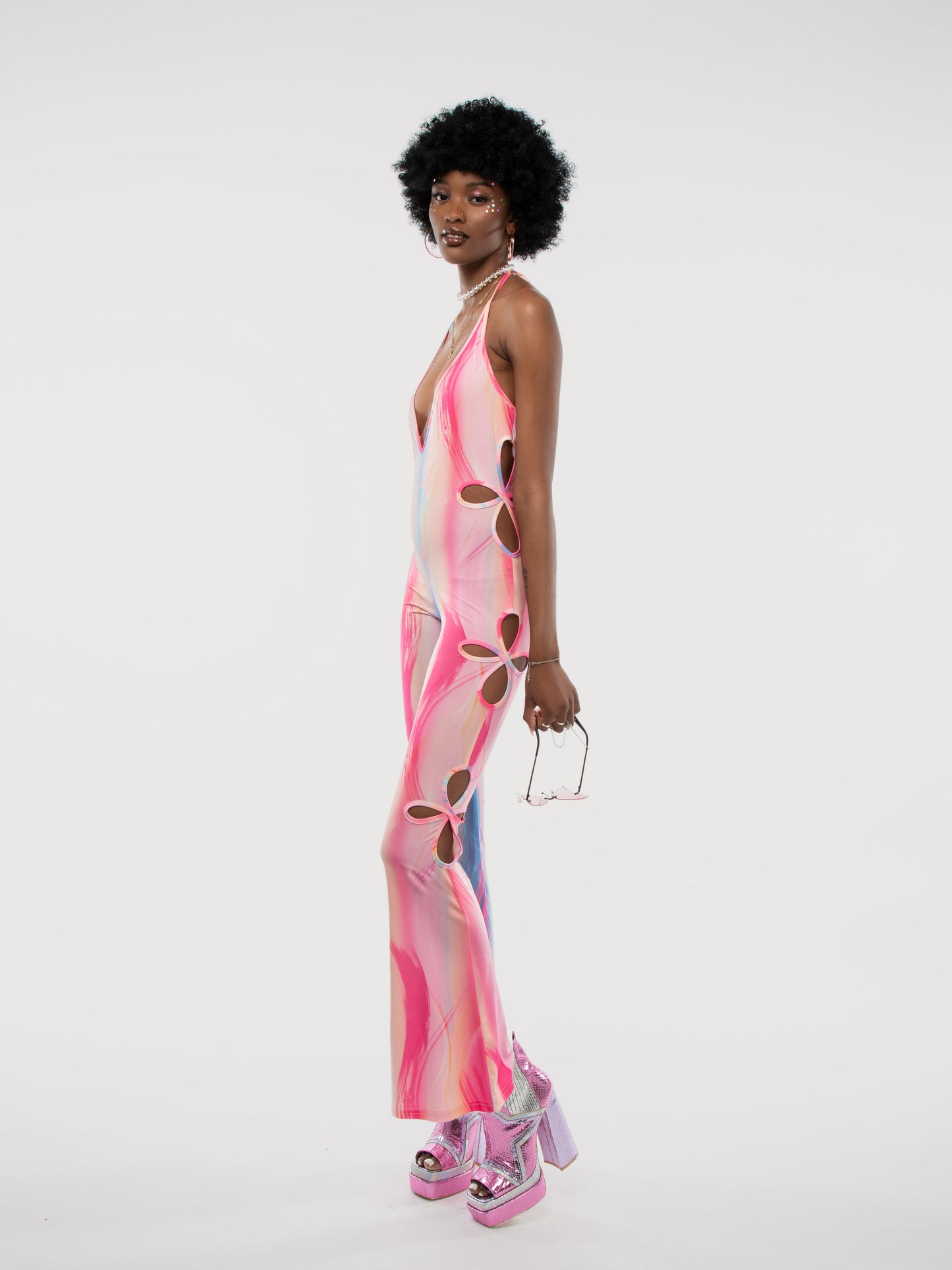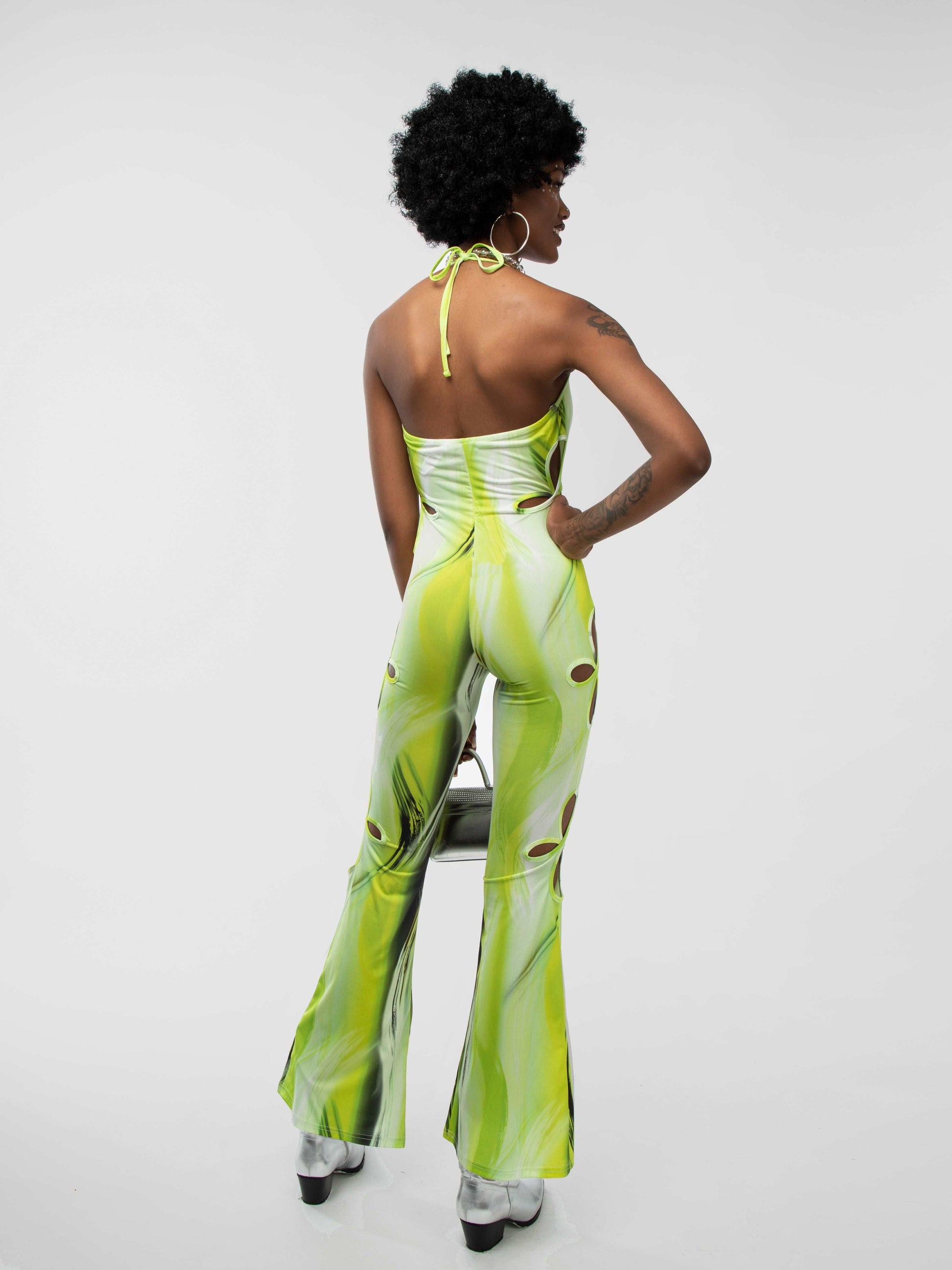 Show Off Your Delicious Curves. Festival Girl's Ombre Effect Print Flower Cut-Out Halter Neck Flared Jumpsuit. Style with Your Fav Boots to Make them Stop and Stare.