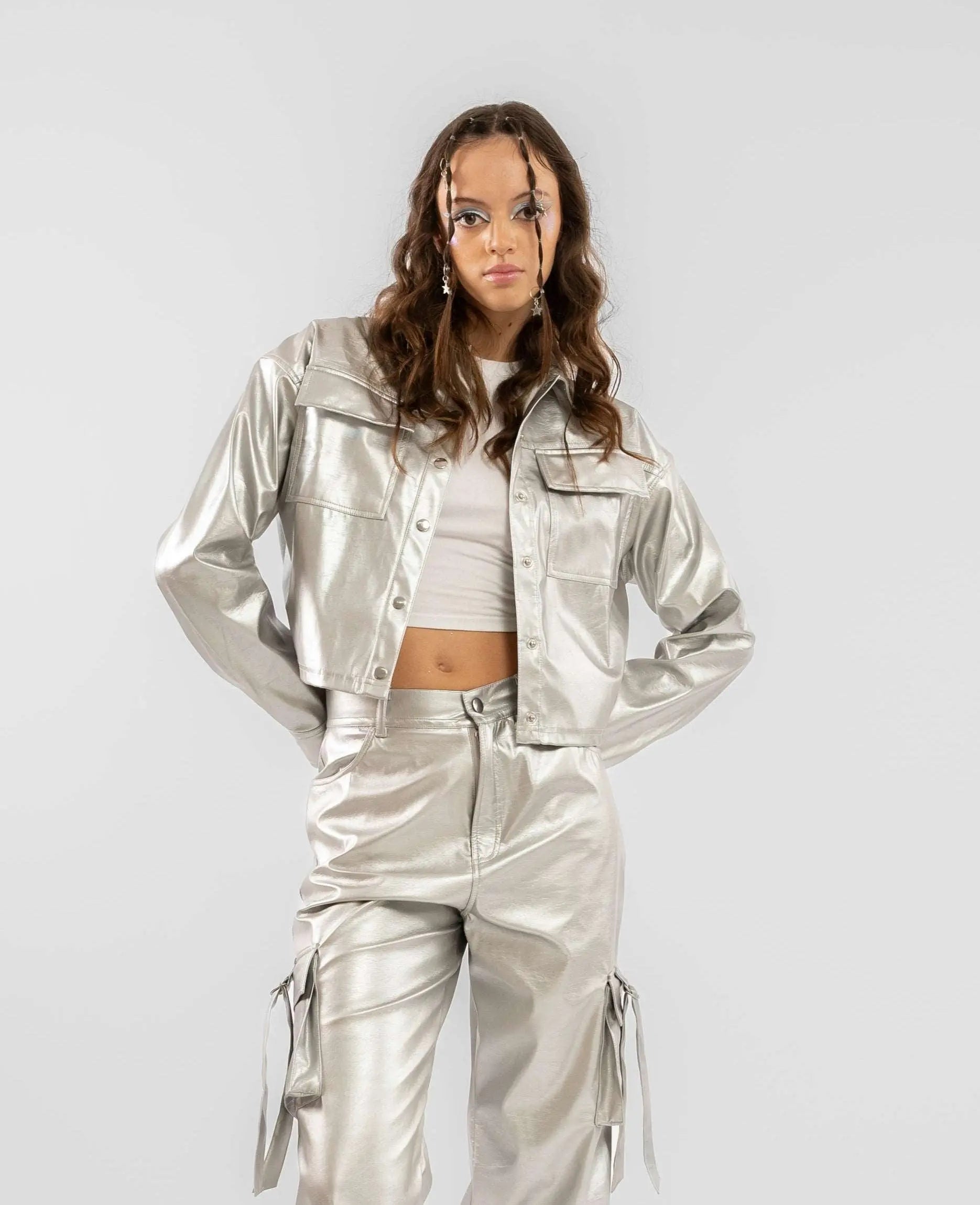 Hello Space Queen! This Silver Metallic Trucker Jacket is Eva's Show-Stopping Piece this Se4ason, Dare to Match with our Silver Cargo! Silver Coated Faux Leather Trucker Jacket Expertly crafted with a silver metallic finish, this trucker jacket is a must-have for any fashion-forward wardrobe. The Eva-inspired design is versatile and can be paired seamlessly with the silver cargo, creating a cohesive and fashion-forward look. Made with high-quality faux leather, this jacket boasts both style and comfort, making it a truly exceptional piece for the season.