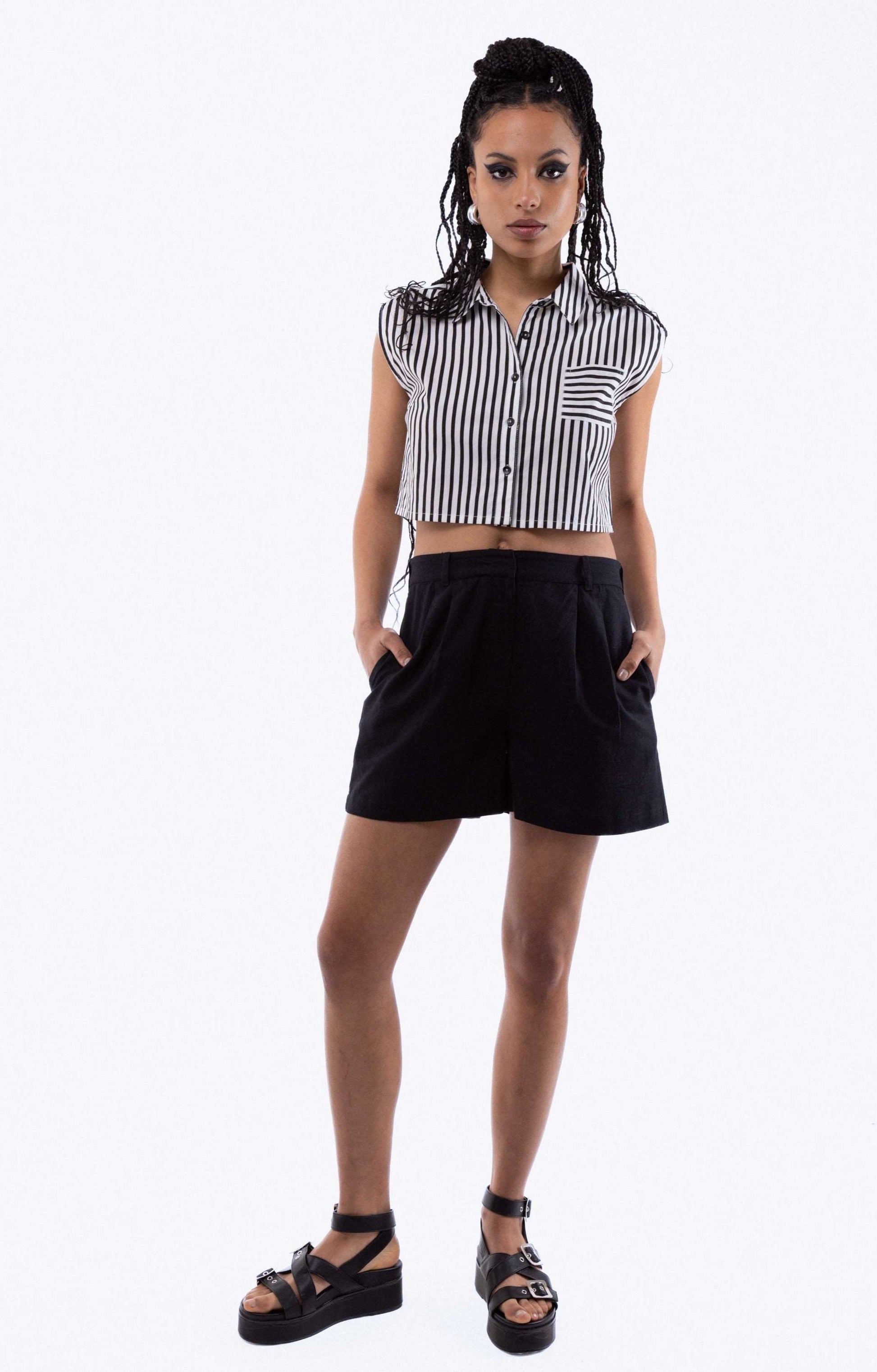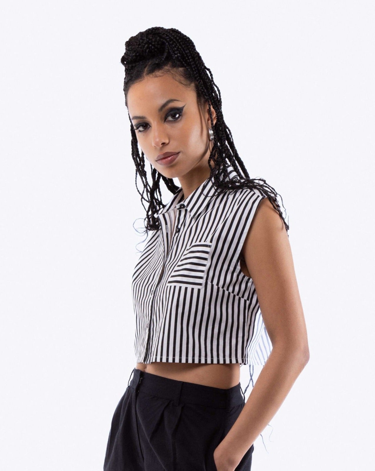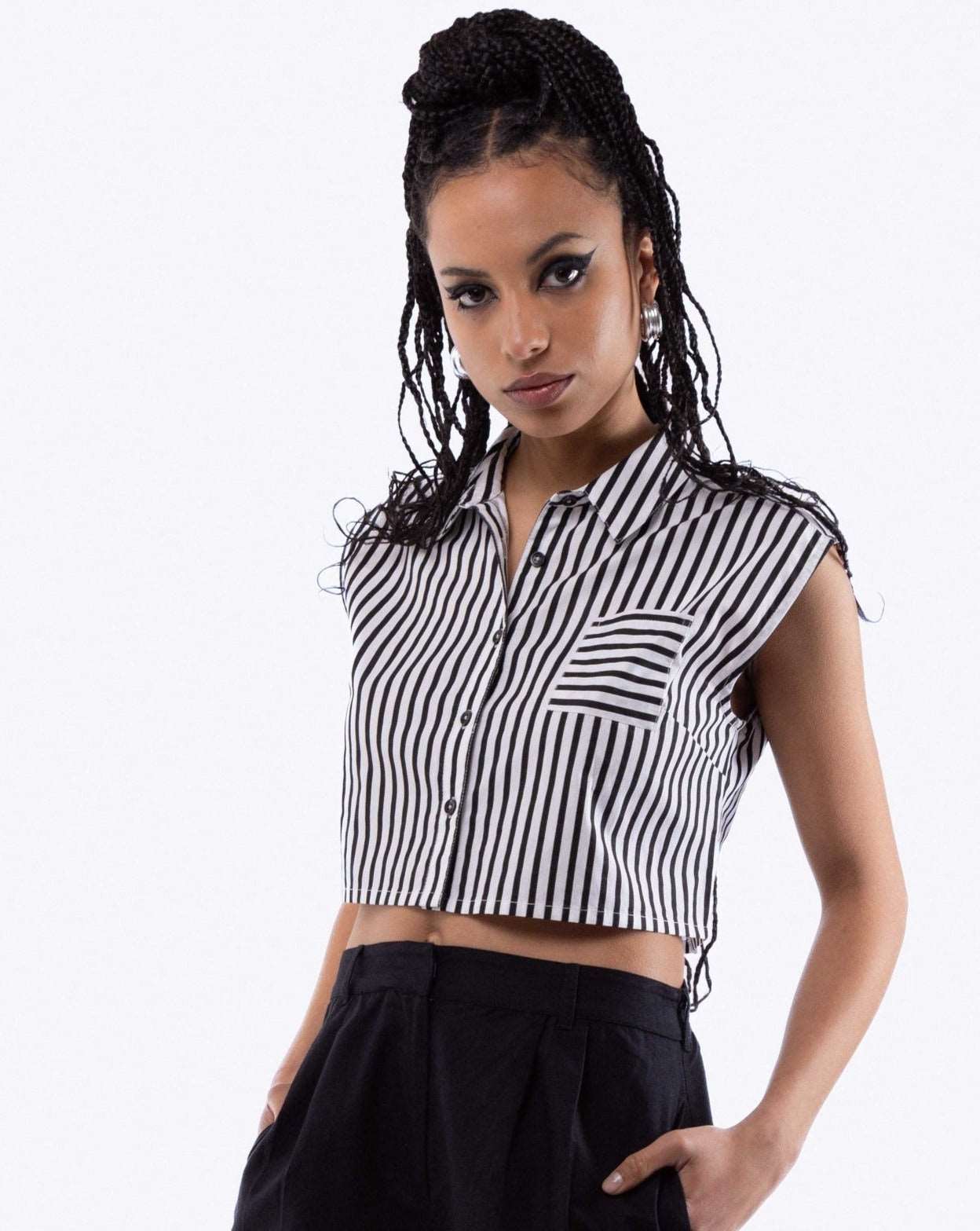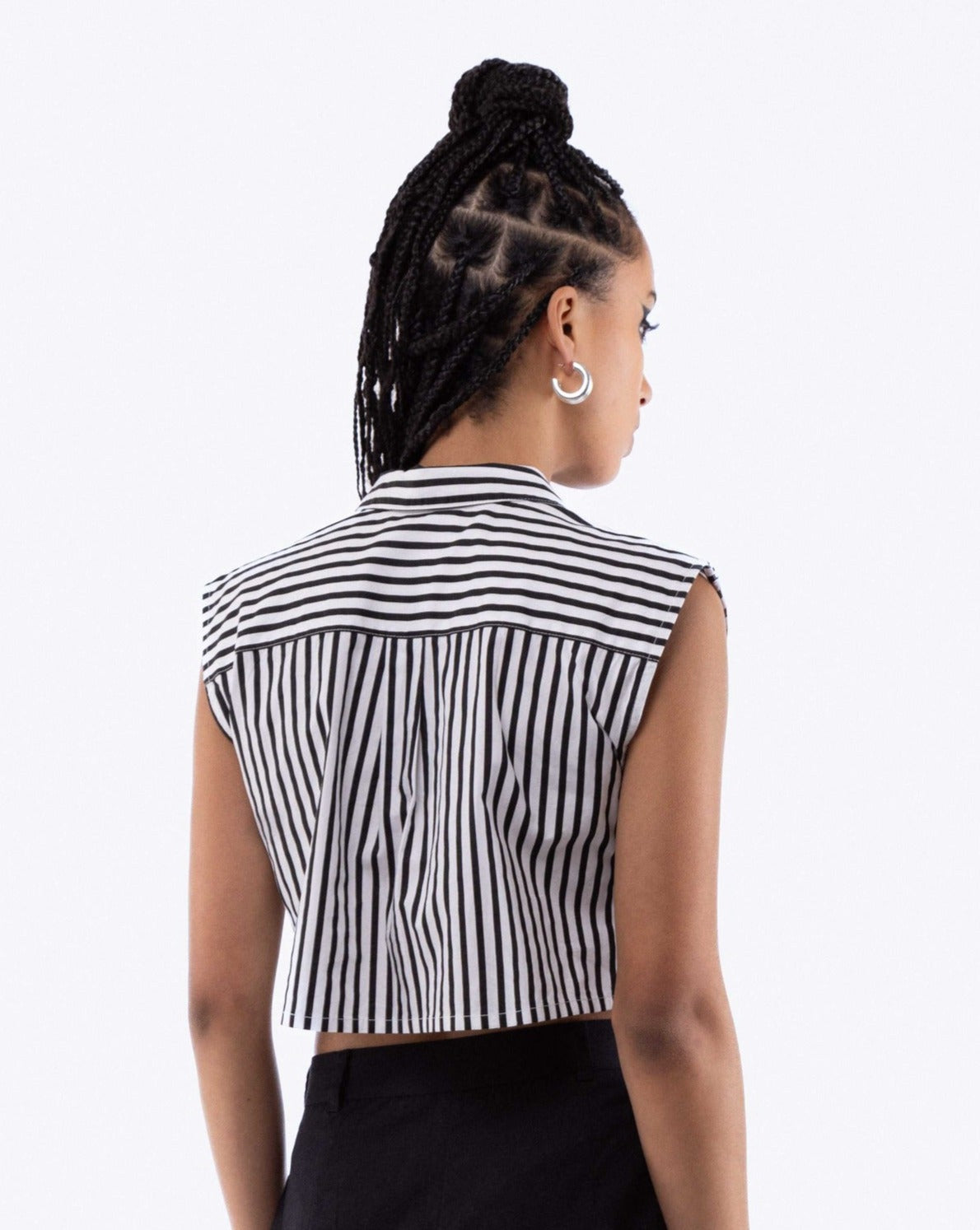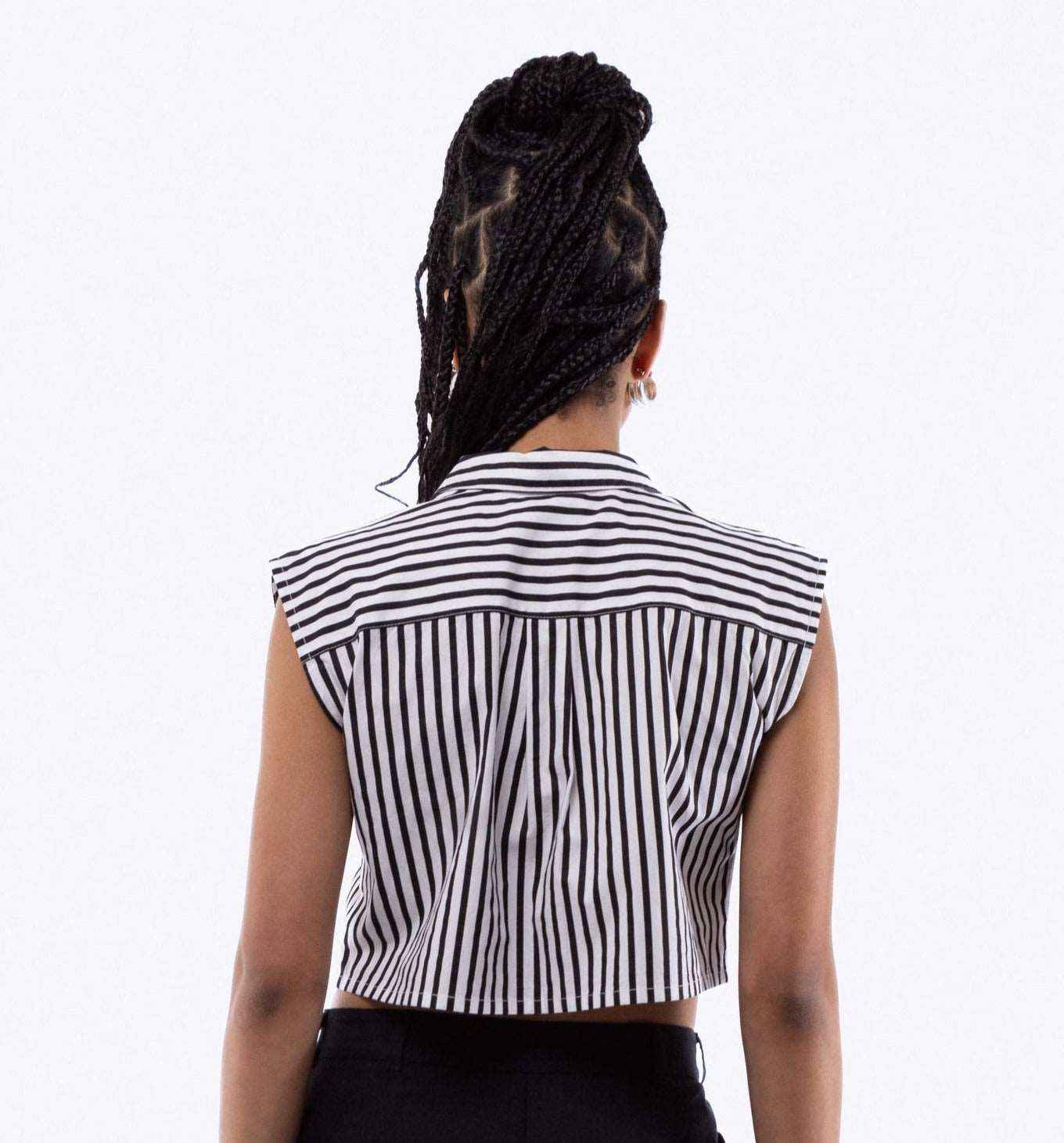 SLEEVELESS STRIPE CROP SHIRT IN BLACK