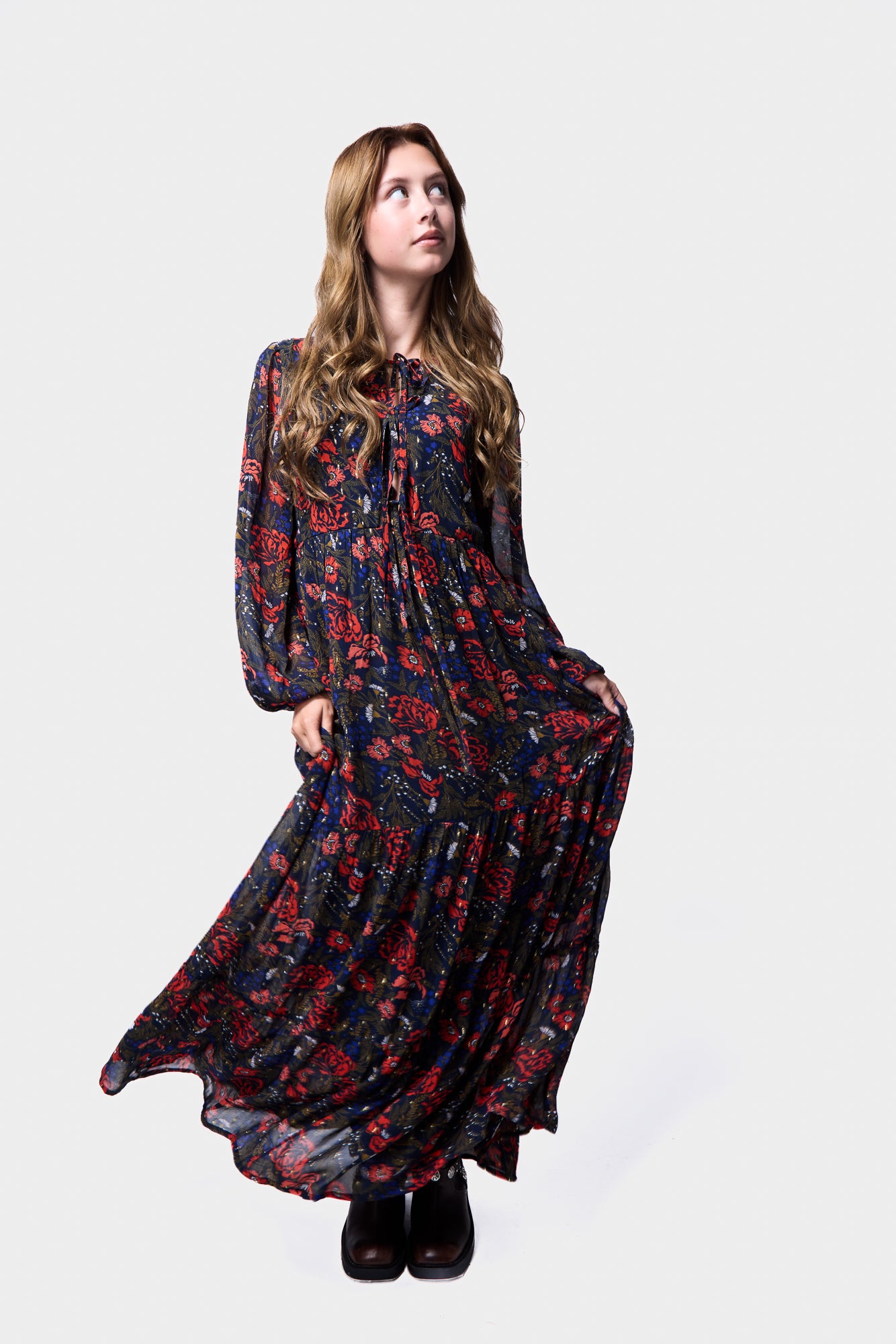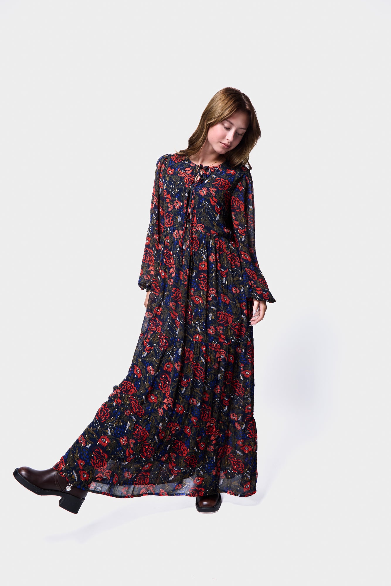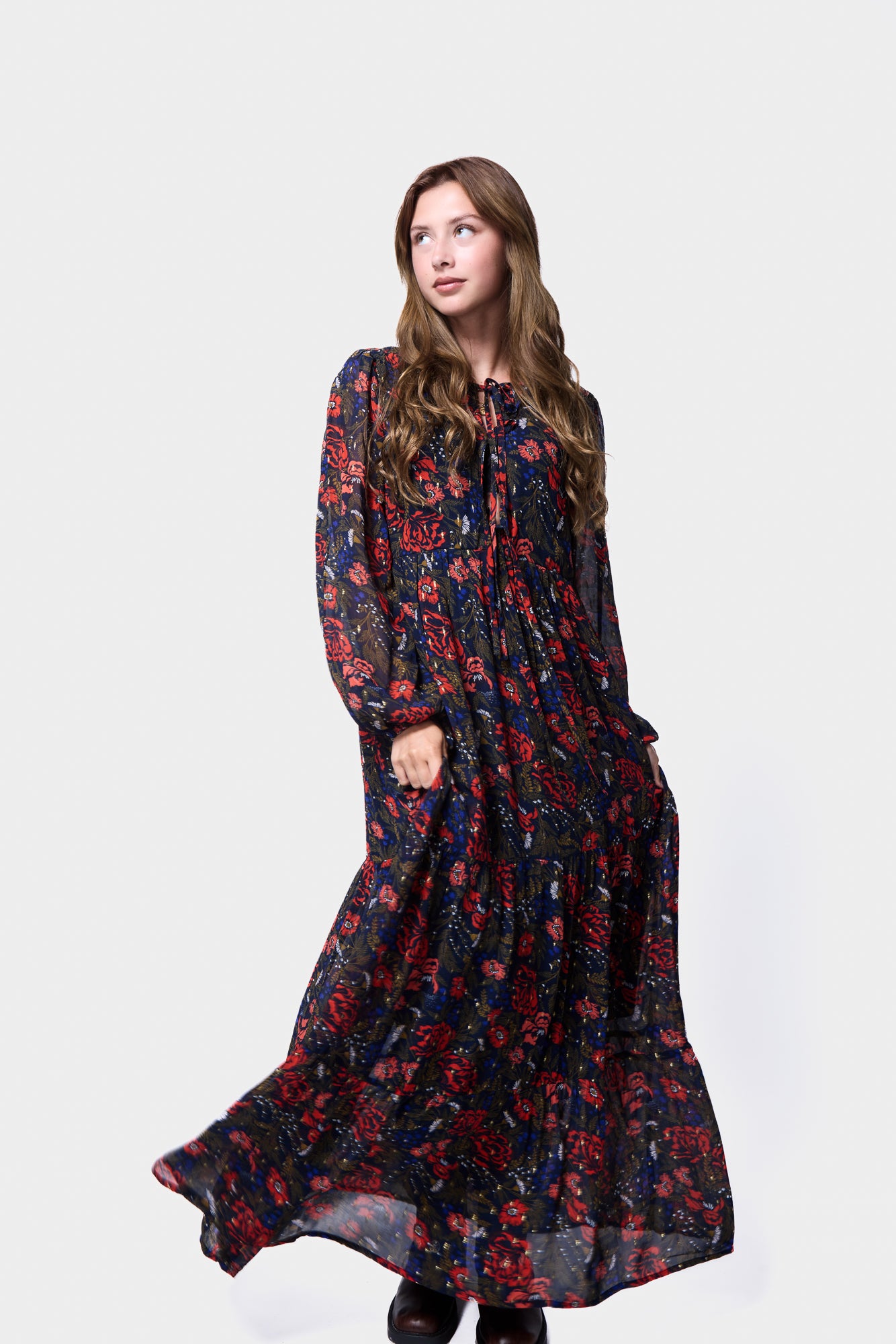 The Swiss dot texture and gold lurex threading give the dress a luxurious feel, while the flattering silhouette ensures a timeless look.