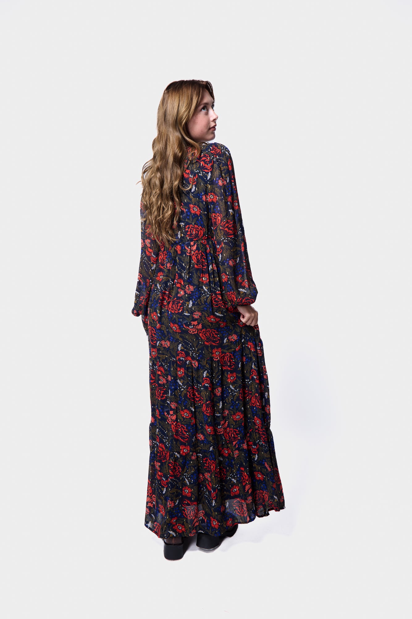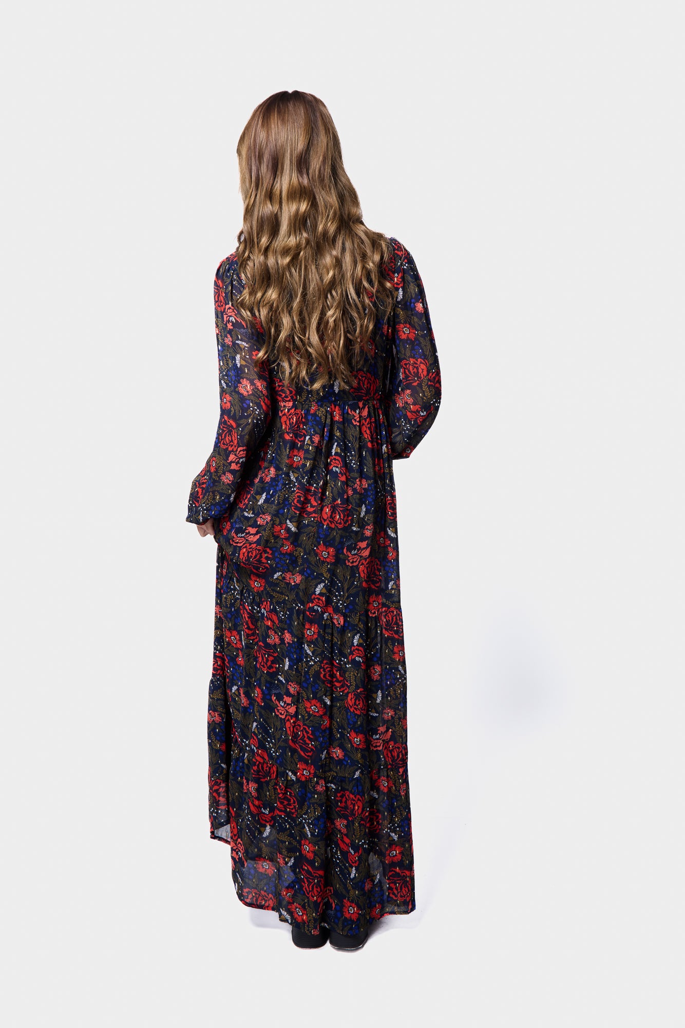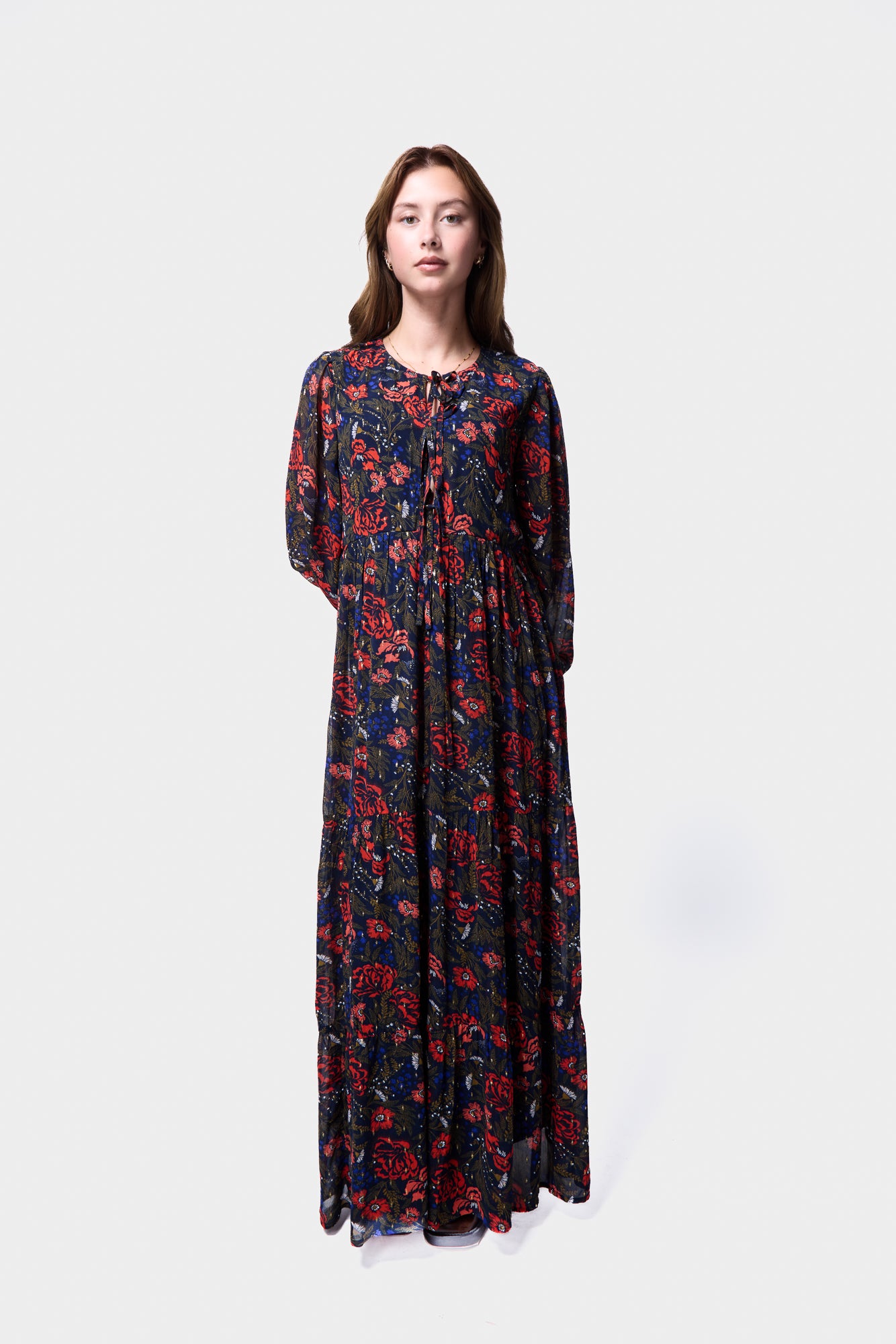 The Swiss dot texture and gold lurex threading give the dress a luxurious feel, while the flattering silhouette ensures a timeless look.