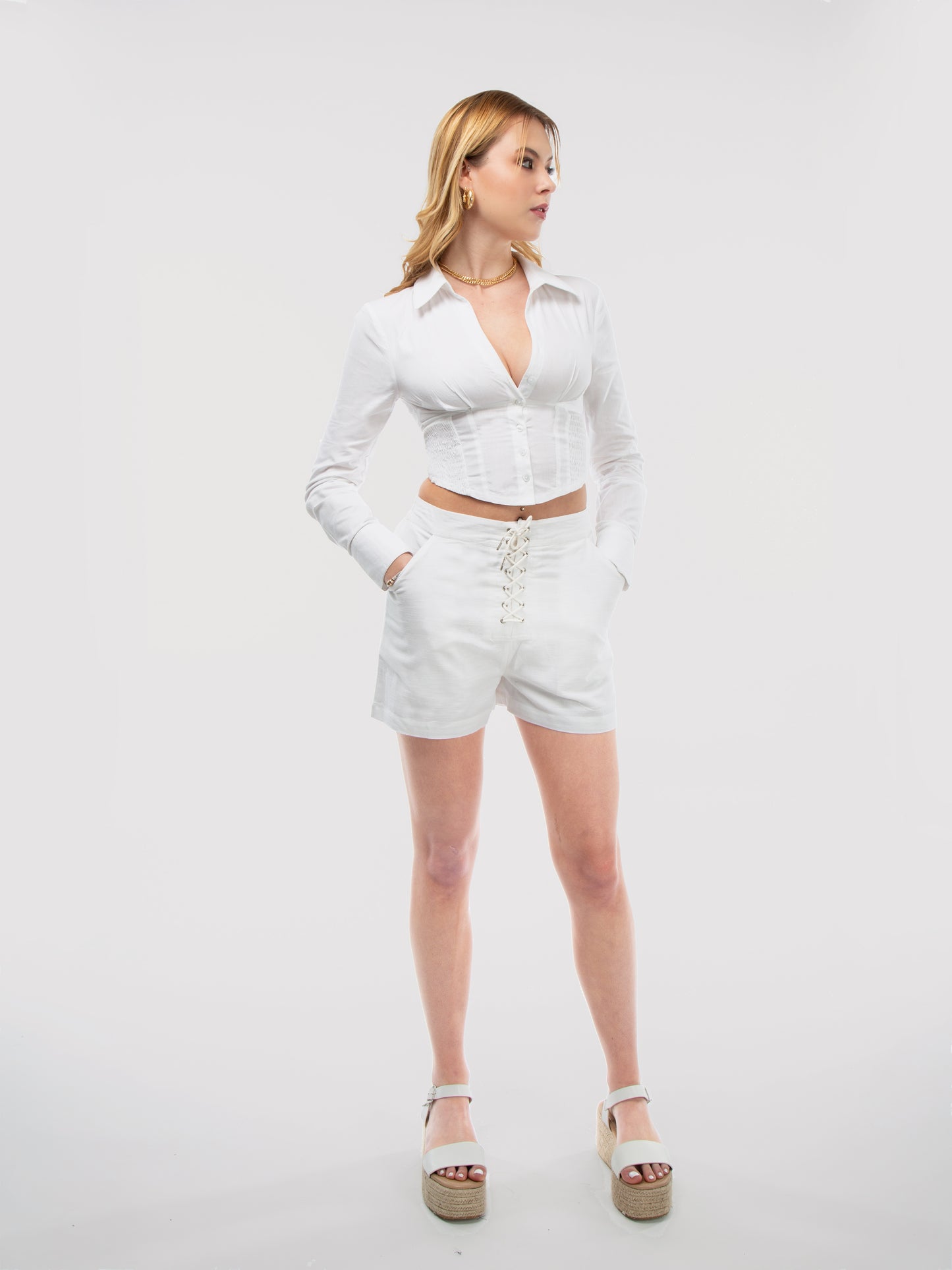 It's All About the Details. Girly Girl's White Corset Detail Crop Shirt. Pair With Linen Lace Up Shorts to Step up Your Style.