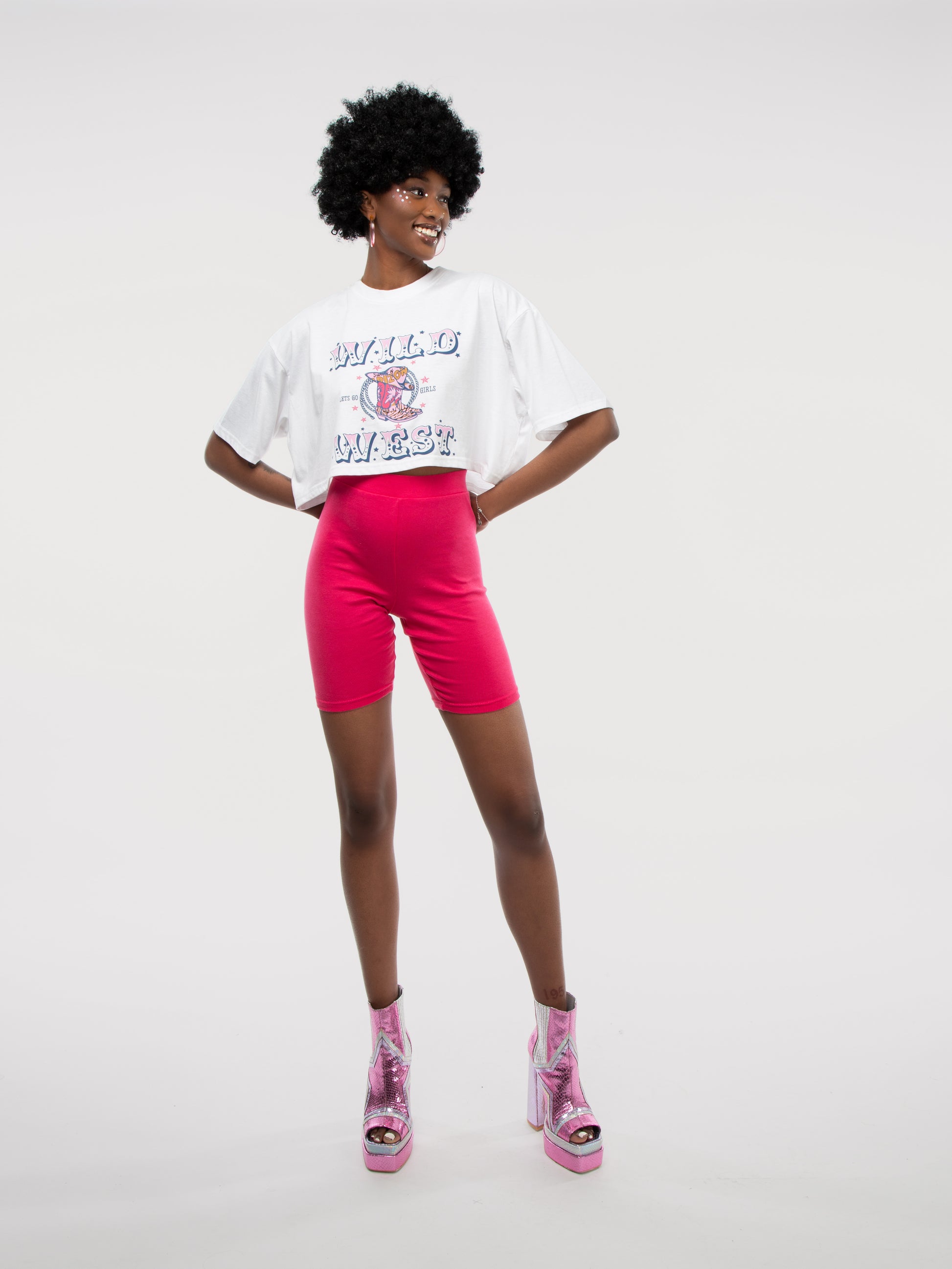A must-have Addition to your festival Wardrobe, The White Drop Shoulders Oversized Cropped Tee with a Wild West Print Design. Pair with Shorts and Cowboy Boots to Steal the Show.